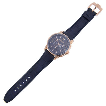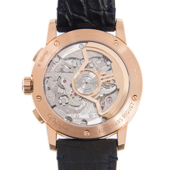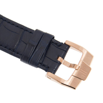 18kt rose gold case with a blue alligator band. Fixed 18kt rose gold bezel. Blue dial with gold-tone hands and index hour markers. Tachymeter scale around the outer rim. Dial Type: Analog. Date display between 4 and 5 o'clock position. Chronograph - three sub-dials displaying: 60 second, 30 minute and 12 hour. Audemars Piguet Calibre 4401 Automatic movement, containing 40 Jewels, composed of 367 parts, bitting at 28800 vph, and has a power reserve of approximately 70 hours. Scratch resistant sapphire crystal. Transparent case back. Round case shape, case size: 41 mm, case thickness: 12.6 mm. Tang clasp. Water resistant at 30 meters / 100 feet. Functions: chronograph, column wheel, flyback, date, hour, minute, second. Additional Info: original box, international warranty card, manual (complete accessories). Luxury watch style. Watch label: Swiss Made. Audemars Piguet Code 11.59 Chronograph Automatic Blue Dial Men's Watch 26393OR.OO.A321CR.01.