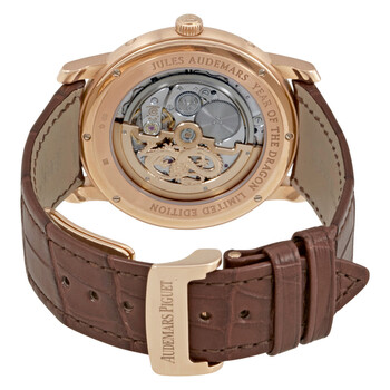 18kt rose gold case with a brown crocodile leather strap. Fixed 18kt rose gold bezel. Lacquered enamel dial with rose gold-tone hands and Roman numeral hour markers. Dial Type: Analog. Four sub-dials displaying: month, date, day of the week and moonphases. Automatic movement with a 40-hour power reserve. Scratch resistant glareproof sapphire crystal. Transparent glareproof sapphire case back. Case diameter: 41 mm. Case thickness: 9.15 mm. Round case shape. 18k pink gold fold over clasp. Water resistant at 20 meters / 66 feet. Functions: chronograph, day, date, month, hour, minute, second, leap year, moonphases. Luxury watch style. Watch label: Swiss Made. Audemars Piguet Dragon Automatic Enamel Dial Brown Leather Men's Watch 26391OR.OO.D088CR.01.