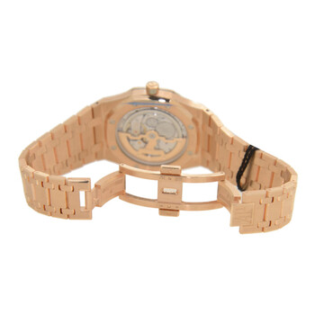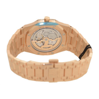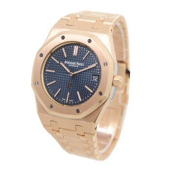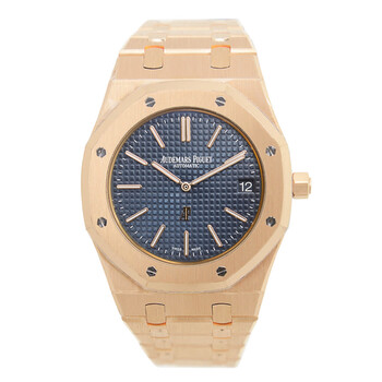 18kt rose gold case with a 18kt rose gold bracelet. Fixed 18kt rose gold bezel. Blue petite tapisserie dial with rose gold-tone hands and stick hour markers. Minute markers around the outer rim. Dial Type: Analog. Luminescent hands and markers. Date display appears at the 3 o'clock position. Automatic movement with a 40-hour power reserve. Scratch resistant sapphire crystal. Screw down crown. Skeleton case back. Case diameter: 39 mm. Case thickness: 8.1 mm. Octagonal case shape. Deployment clasp with a push button release. Water resistant at 50 meters / 165 feet. Functions: date, hour, minute, second. Luxury watch style. Watch label: Swiss Made. Audemars Piguet Extra-Thin Royal Oak Automatic Blue Dial 18 kt Rose Gold Men's Watch 15202OR.OO.1240OR.01.