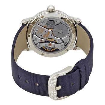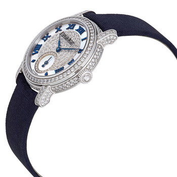 18kt white gold case with a blue satin strap. Fixed 18kt white gold bezel set with diamonds. Mother of pearl diamond-set dial with blue hands and Roman numeral hour markers. Dial Type: Analog. Mother of pearl seconds sub-dial set with diamond. Audemars Piguet calibre 3090 hand wind movement with a 48-hour power reserve. Scratch resistant sapphire crystal. Pull / push crown. Transparent case back. Case size: 29 mm. Round case shape. Tang clasp. Water resistant at 30 meters / 100 feet. Functions: hour, minute, second. Additional Info: all diamonds are top Wesselton IF quality: case, bezel, lugs & pin buckle set with 200 brilliant cut round diamonds weighing approximately 1.39 carats. Luxury watch style. Watch label: Swiss Made. Item Variations: 77229BC ZZ A025MR 01, 77229BC-ZZ-A025MR-01, 77229BCZZA025MR01. Audemars Piguet Jules Audemars Diamond Manual Winding Ladies Watch 77229BC.ZZ.A025MR.01.