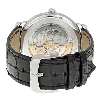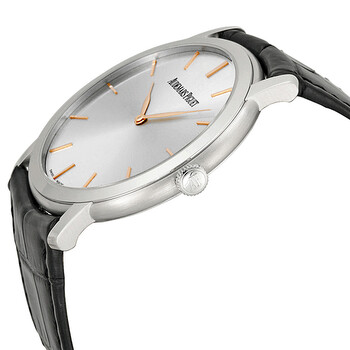 18kt white gold case with a black (alligator) leather strap. Fixed 18kt white gold bezel. Silver dial with rose gold hands and index hour markers. Dial Type: Analog. Audemars Piguet calibre 2120 automatic movement, containing 36 Jewels, composed of 212 parts, bitting at 19800 vph, and has a power reserve of approximately 40 hours. Scratch resistant sapphire crystal. Pull / push crown. Transparent case back. Round case shape. Case size: 41 mm. Case thickness: 6.7 mm. Tang clasp. Water resistant at 20 meters / 65 feet. Functions: hour, minute. Jules Audemars Extra Thin Series. Luxury watch style. Watch label: Swiss Made. Item Variations: 15180BC OO A002CR 01, 15180BC-OO-A002CR-01, 15180BCOOA002CR01. Audemars Piguet Jules Audemars Extra Thin Silver Dial Automatic Men's Watch 15180BCOOA002CR01.