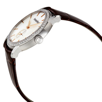 18kt white gold case with a brown alligator leather strap. Fixed 18kt white gold bezel set with 60 diamonds. Mother of pearl dial with rose gold-tone hands and index hour markers. Dial Type: Analog. Small seconds sub-dial at the 6 o'clock position. Audemars Piguet calibre 3090 hand wind movement with a 48-hour power reserve. Scratch resistant sapphire crystal. Pull / push crown. Skeleton case back. Case size: 33 mm. Case thickness: 7.15 mm. Round case shape. Tang clasp. Water resistant at 20 meters / 65 feet. Functions: hour, minute, second. Additional Info: 60 brilliant-cut diamonds; 0.69 carats. Luxury watch style. Watch label: Swiss Made. Item Variations: 77240BC ZZ A808CR 01, 77240BC-ZZ-A808CR-01, 77240BCZZA808CR01. Audemars Piguet Jules Audemars Manual Wind Diamond Mother of Pearl Dial Ladies Watch 77240BC.ZZ.A808CR.01.