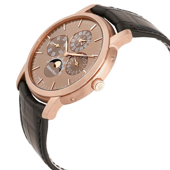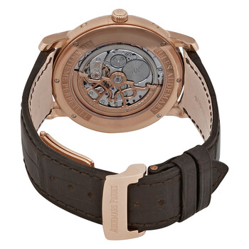 18 kt rose gold case with a brown alligator leather strap. Fixed bezel. Brown dial with rose gold-tone hands and stick hour markers. Minute markers around the outer rim. Dial Type: Analog. Month, day of the week and date sub-dials. Automatic movement. Calibre 2120 / 2802 engine. Scratch resistant sapphire crystal. Pull / push crown. Skeleton case back. Case diameter: 41 mm. Case thickness: 9.15 mm. Round case shape. Tang clasp. Water resistant at 20 meters/ 65 feet. Functions: month, date, day, hour, minute, second, moonphase. Luxury watch style. Watch label: Swiss Made. Item Variations: 26390OR OO D093CR 01, 26390OR-OO-D093CR-01, 26390OROOD093CR01. Audemars Piguet Jules Audemars Perpetual Calendar Automatic Rose Gold Men's Watch 26390OR.OO.D093CR.01.