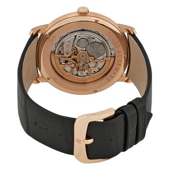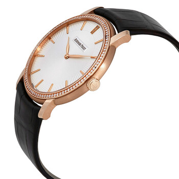 18kt pink gold case with a black leather strap. Fixed 18kt pink gold bezel set with diamonds. White dial with pink gold hands and index hour markers. Dial Type: Analog. Audemars Piguet calibre 2120 automatic movement with a 40-hour power reserve. Scratch resistant sapphire crystal. Pull / push crown. Transparent case back. Case size: 41 mm. Case thickness: 6.7 mm. Round case shape. Deployment clasp. Water resistant at 20 meters / 65 feet. Functions: hour, minute. Luxury watch style. Watch label: Swiss Made. Item Variations: 15182OR ZZ A102CR 01, 15182OR-ZZ-A102CR-01, 15182ORZZA102CR01. Audemars Piguet Jules Audemars Selfwinding Extra-thin 18kt Pink Gold Watch 15182OR.ZZ.A102CR.01.