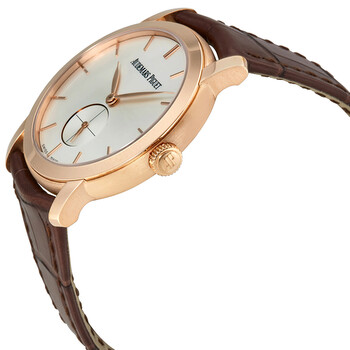 18kt pink gold case with a brown leather strap. Fixed 18kt pink gold bezel. Silver dial with pink golf hands and index hour markers. Dial Type: Analog. Small seconds sub-dial. Audemars Piguet calibre 3090 hand wind movement with a 48-hour power reserve. Scratch resistant sapphire crystal. Pull / push crown. Skeleton case back. Case size: 33 mm. Case thickness: 6.95 mm. Round case shape. 18kt pink gold tang clasp. Water resistant at 20 meters / 65 feet. Functions: hour, minute, second. Luxury watch style. Watch label: Swiss Made. Item Variations: 77238OR OO A088CR 01, 77238OR-OO-A088CR-01, 77238OROOA088CR01. Audemars Piguet Jules Audemars Small Seconds Silver Dial Ladies Watch 77238OR.OO.A088CR.01.