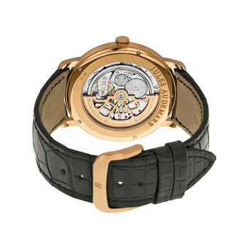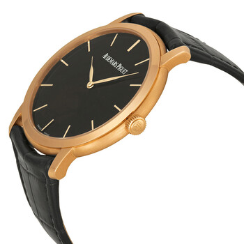 18kt rose gold case with a black leather strap. Fixed 18kt rose gold bezel. Black dial with rose gold hands and index hour markers. Dial Type: Analog. Automatic movement. Scratch resistant sapphire crystal. Pull / push crown. Transparent case back. Case diameter: 41 mm. Case thickness: 6.7 mm. Round case shape. Tang clasp. Water resistant at 20 meters / 66 feet. Functions: hour, minute. Luxury watch style. Watch label: Swiss Made. Audemars Piguet Jules Audemars Ultra Thin Black Dial Automatic Men's Watch 15180OR.OO.A002CR.01.