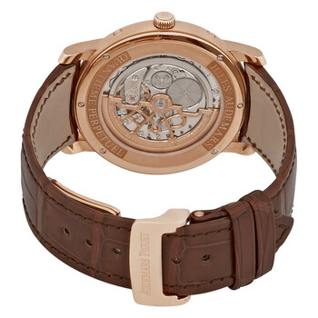 18kt rose gold case with a brown (alligator) leather strap. Fixed 18kt rose gold bezel. Silver dial with gold-tone hands and index hour markers. Minute markers around the outer rim. Dial Type: Analog. Four sub-dials displaying: month, day of the week, date, and moonphase. Audemars Piguet calibre 2120/2802 automatic movement with a 40-hour power reserve. Scratch resistant sapphire crystal. Pull / push crown. Solid case back. Case size: 43 mm. Case thickness: 12.6 mm. Round case shape. Deployment clasp. Water resistant at 20 meters / 65 feet. Functions: perpetual calendar, moon phase, leap year, month, date, day, hour, minute. Dress watch style. Watch label: Swiss Made. Item Variations: 26390OR OO D088CR 01, 26390OR-OO-D088CR-01, 26390OROOD088CR01. Audemars Piguet Jules Automatic Men's Watch 26390OROOD088CR01.