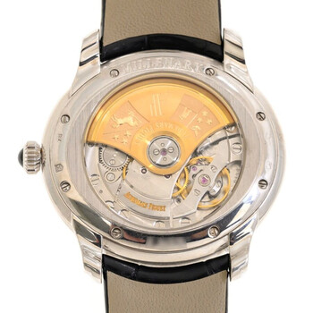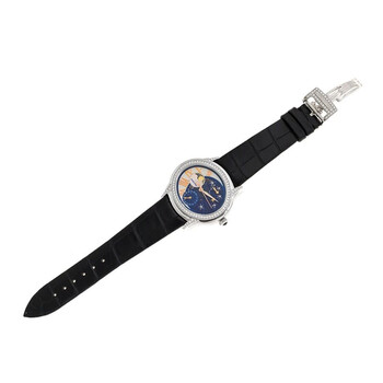 18kt White Gold case. Blue Satin bracelet. Mother of Pearl / Midnight Blue dial. Fixed bezel with diamonds. Scratch Resistant Sapphire crystal. Deployant clasp. Automatic movement. 39.5mm case diameter. Water Resistant to 20m / 65ft. Case in solid 18kt White Gold with brushed finished edges & polished/shiny finished lugs & bezel. Bezel, Lugs & Buckle set with 112 Top Wesselton IF Quality brilliant (round) cut diamonds weighing approximately 1.05 carats. Sapphire cabochon set in crown weighing approximately 0.25 carats. Polished white gold hour & minute hands, Rose Gold seconds hand. Dial: Crescent shaped mother-of-pearl outer diameter with fine engraved texture. Also features polished rose gold applied Roman Numeral hour markers from 7 to 11. Midnight blue (electric dark blue) offset center dial with stardust motif & 6 diamonds. Shaded painted blue Arabic Numeral hour markers from 12 - 6. Date sub-dial. Moonphase sub-dial in mother-of-pearl. Power Reserve indicator hand. Audemars Piguet Millenary Starlit Sky Automatic Ladies Watch 77315BC.ZZ.D007SU.01.