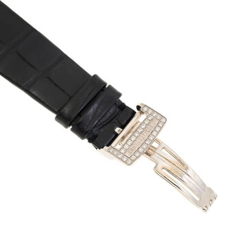 Case in solid 18kt White Gold with brushed finished edges & polished/shiny finished lugs & bezel. Bezel, Lugs & Buckle set with 112 Top Wesselton IF Q