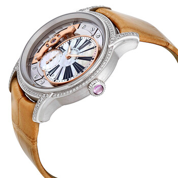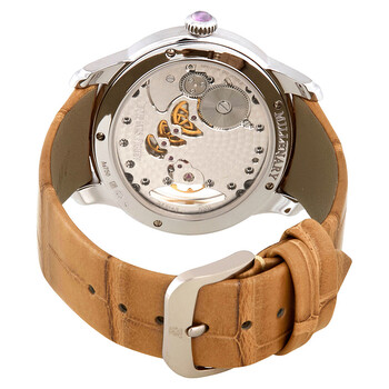 18 carat white gold case with a beige alligator leather strap. Fixed set with diamonds bezel. White mother of pearl dial with pink gold hands and Roman numeral hour markers. Dial Type: Analog. One- 60 seconds. Hand wind movement. Manufacture 5201 engine. Scratch resistant sapphire crystal. Skeleton transparent exhibition see through case back. Case diameter: 39.50 mm. Case thickness: 9.80 mm. Oval case shape. Water resistant at 100 meters / 330 feet. Functions: hour, minute, second. Additional Info: bezel and lugs set with 116 brilliant-cut diamonds;( ~0.60 carats). Luxury watch style. Watch label: Swiss Made. Audemars Piguet Millenary White Mother Of Pearl Dial Hand Wind Ladies Watch 77247BC.ZZ.A813CR.01.