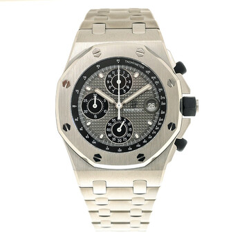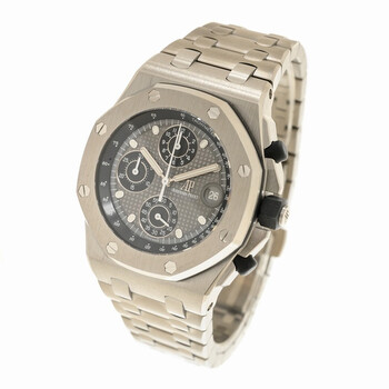 Grey titanium case and bracelet. Fixed grey titanium bezel. Grey dial with silver-tone hands and index hour markers. Minute markers around the outer rim. Dial Type: Analog. Luminescent hands and markers. Date display at the 3 o'clock position. Chronograph - three sub-dials displaying: 60 second, 30 minute and 12 hour. Audemars Piguet Calibre 4404 automatic movement with a 70-hour power reserve. Scratch resistant sapphire crystal. Screw down crown. Transparent see through case back. Octagon case shape, case size: 42 mm, case thickness: 15.2 mm. Deployment with push button release clasp. Water resistant at 100 meters / 330 feet. Functions: chronograph, date, hour, minute, second. Offshore Royal Oak Series. Sport watch style. Watch label: Swiss Made. Audemars Piguet Offshore Royal Oak Chronograph Automatic Grey Dial Men's Watch 26238TI.OO.2000TI.01.