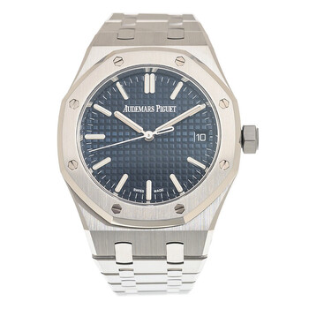 Stainless steel case with a silver-tone stainless steel bracelet. Fixed silver-tone stainless steel bezel. Blue dial with index hour markers. Dial Type: Analog. Date display at the 3 o'clock position. Audemars Piguet Calibre 5900 automatic movement. Scratch resistant sapphire crystal. Screw down crown. Transparent see through case back. Case size: 37 mm, case thickness: 9 mm. Deployment clasp. Water resistant at 50 meters / 165 feet. Functions: date, hour, minute, second. Additional Info: original box, manual (complete accessories). Royal Oak Series. Luxury watch style. Watch label: Swiss Made. Audemars Piguet Royal Oak "50TH ANNIVERSARY" Automatic Blue Dial Unisex Watch 15550STOO1356ST02.