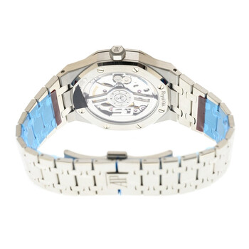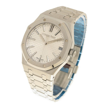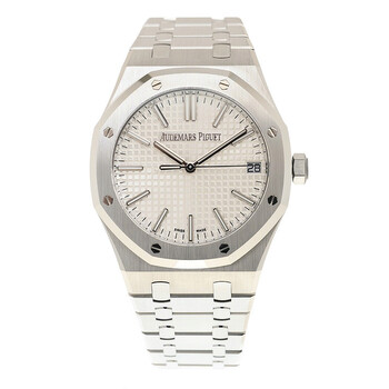 Silver-tone stainless steel case and bracelet. Fixed silver-tone stainless steel bezel. Silver-tone dial with silver-tone hands and index hour markers. Minute markers around the outer rim. Dial Type: Analog. Luminescent hands and markers. Date display at the 3 o'clock position. Audemars Piguet Calibre 4302 Automatic movement, containing 32 Jewels, bitting at 28800 vph, and has a power reserve of approximately 70 hours. Scratch resistant sapphire crystal. Screw down crown. Transparent see through case back. Octagon case shape, case size: 41 mm, case thickness: 10.5 mm. Deployment with push button release clasp. Water resistant at 50 meters / 165 feet. Functions: date, hour, minute, second. Additional Info: original box, international warranty card, manual (complete accessories). Royal Oak "50th Anniversary" Series. Luxury watch style. Watch label: Swiss Made. Audemars Piguet Royal Oak "50th Anniversary" Automatic Silver Dial Men's Watch 15510ST.OO.1320ST.03.
