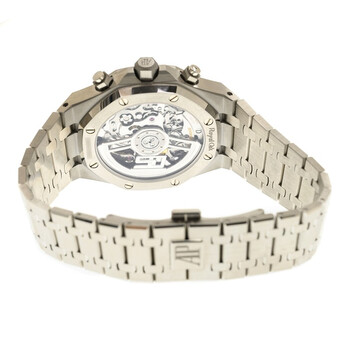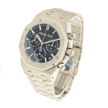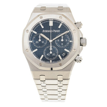 Silver-tone stainless steel case and bracelet. Fixed silver-tone stainless steel bezel. Blue dial with silver-tone hands and index hour markers. Minute markers around the outer rim. Dial Type: Analog. Luminescent hands and markers. Date display between 4 and 5 o'clock position. Chronograph - three sub-dials displaying: 60 second, 30 minute and 12 hour. Audemars Piguet Calibre 4401 Automatic movement, containing 40 Jewels, composed of 367 parts, bitting at 28800 vph, and has a power reserve of approximately 70 hours. Scratch resistant sapphire crystal. Screw down crown. Transparent see through case back. Octagon case shape, case size: 41 mm. Deployment with push button release clasp. Water resistant at 50 meters / 165 feet. Functions: chronograph, column wheel, flyback, date, hour, minute, second. Additional Info: original box, manual (complete accessories). Royal Oak Series. Luxury watch style. Watch label: Swiss Made. Audemars Piguet Royal Oak Chronograph A