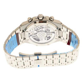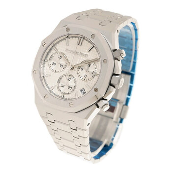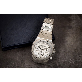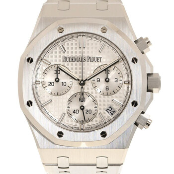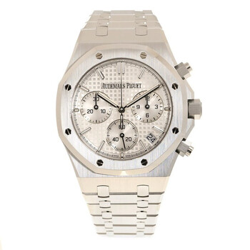 Silver-tone stainless steel case and bracelet. Fixed silver-tone stainless steel bezel. Silver-tone dial with silver-tone hands and index hour markers. Minute markers around the outer rim. Dial Type: Analog. Date display between 4 and 5 o'clock position. Chronograph - three sub-dials displaying: 60 second, 30 minute and 12 hour. Audemars Piguet Calibre 4401 Automatic movement, containing 40 Jewels, composed of 367 parts, bitting at 28800 vph, and has a power reserve of approximately 70 hours. Scratch resistant sapphire crystal. Screw down crown. Transparent see through case back. Octagon case shape, case size: 41 mm. Deployment with push button release clasp. Water resistant at 50 meters / 165 feet. Functions: chronograph, column wheel, flyback, date, hour, minute, second. Additional Info: original box, manual (complete accessories). Royal Oak Series. Luxury watch style. Watch label: Swiss Made. Audemars Piguet Royal Oak Chronograph Automatic Silver Dial Men's Watch 26240ST.OO.1320ST.03.