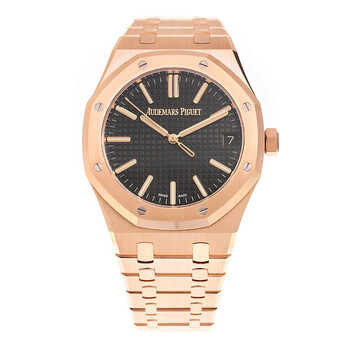 Rose gold-tone 18kt rose gold case and bracelet. Fixed rose gold-tone 18kt rose gold bezel. Black dial with rose gold-tone hands and index hour markers. Minute markers around the outer rim. Dial Type: Analog. Luminescent hands and markers. Date display at the 3 o'clock position. Audemars Piguet Calibre 4302 Automatic movement, containing 32 Jewels, bitting at 28800 vph, and has a power reserve of approximately 70 hours. Scratch resistant sapphire crystal. Screw down crown. Round case shape, case size: 41 mm, case thickness: 10.5 mm. Fold over clasp with a safety release. Water resistant at 50 meters / 165 feet. Functions: date, hour, minute, second. Additional Info: original box, manual (complete accessories). Royal Oak Series. Luxury watch style. Watch label: Swiss Made. Audemars Piguet Royal Oak Automatic Black Dial Men's Watch 15510OR.OO.1320OR.04.
