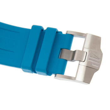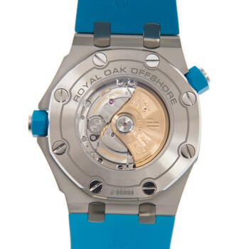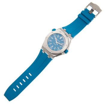 Silver-tone stainless steel case with a blue rubber strap. Fixed silver-tone stainless steel bezel. Blue dial with silver-tone hands and index hour markers. Minute markers around the outer rim. Dial Type: Analog. Luminescent hands and markers. Date display at the 3 o'clock position. Audemars Piguet Calibre 3120 automatic movement with a 60-hour power reserve. Scratch resistant sapphire crystal. Screw down crown. Transparent case back. Octagonal case shape, case size: 42 mm, case thickness: 14 mm. Band width: 20 mm. Tang clasp. Water resistant at 300 meters / 1000 feet. Functions: date, hour, minute, second. Additional Info: rotating inner bezel. Luxury watch style. Watch label: Swiss Made. Audemars Piguet Royal Oak Automatic Blue Dial Men's Watch 15710STOOA032CA01.