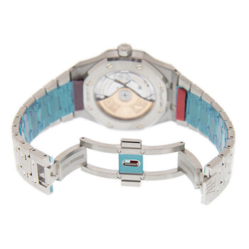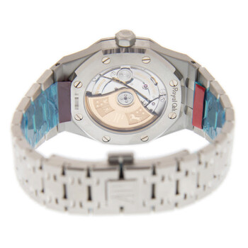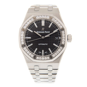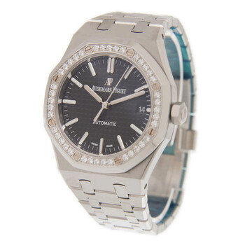 Silver-tone stainless steel case and bracelet. Fixed silver-tone bezel with diamond set stainless steel. Black dial with silver-tone hands and index hour markers. Minute markers around the outer rim. Dial Type: Analog. Luminescent hands and markers. Date display at the 3 o'clock position. Automatic movement. Scratch resistant sapphire crystal. Screw down crown. Transparent see through case back. Octagon case shape, case size: 37 mm. Deployment with push button release clasp. Water resistant at 50 meters / 165 feet. Functions: date, hour, minute, second. Additional Info: original box, international warranty card, manual (complete accessories). Royal Oak Series. Luxury watch style. Watch label: Swiss Made. Audemars Piguet Royal Oak Automatic Diamond Black Dial Unisex Watch 15451ST.ZZ.1256ST.01.A.