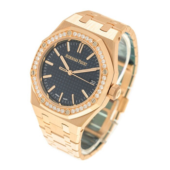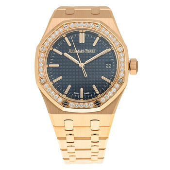 Rose gold-tone 18kt rose gold case and bracelet. Fixed rose gold-tone bezel with diamond set 18kt rose gold. Blue dial with rose gold-tone hands and index hour markers. Minute markers around the outer rim. Dial Type: Analog. Luminescent hands and markers. Date display at the 3 o'clock position. Audemars Piguet Calibre 5900 automatic movement with a 60-hour power reserve. Scratch resistant sapphire crystal. Screw down crown. Transparent see through case back. Octagon case shape, case size: 37 mm, case thickness: 9 mm. Deployment with push button release clasp. Water resistant at 50 meters / 165 feet. Functions: date, hour, minute, second. Additional Info: 40 brilliant-cut diamonds; ~0.92 carat (bezel). Royal Oak Series. Luxury watch style. Watch label: Swiss Made. Audemars Piguet Royal Oak Automatic Diamond Blue Dial Ladies Watch 15551OR.ZZ.1356OR.02.
