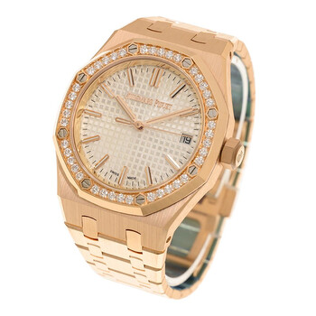 Rose gold-tone 18kt rose gold case and bracelet. Fixed rose gold-tone bezel with diamond set 18kt rose gold. Silver-tone dial with rose gold-tone hands and index hour markers. Minute markers around the outer rim. Dial Type: Analog. Date display at the 3 o'clock position. Audemars Piguet Calibre 5900 automatic movement with a 60-hour power reserve. Scratch resistant sapphire crystal. Screw down crown. Transparent see through case back. Octagon case shape, case size: 37 mm. Deployment with push button release clasp. Water resistant at 50 meters / 165 feet. Functions: date, hour, minute, second. Additional Info: original box, international warranty card, manual (complete accessories). Royal Oak Series. Luxury watch style. Watch label: Swiss Made. Audemars Piguet Royal Oak Automatic Diamond Silver Dial Ladies Watch 15551OR.ZZ.1356OR.01.