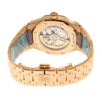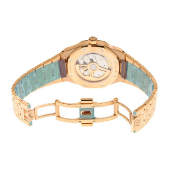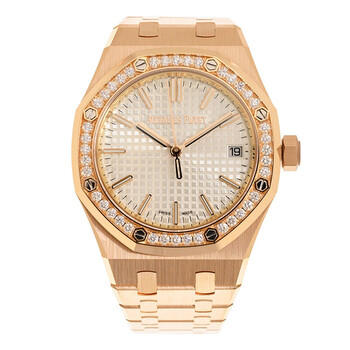 Rose gold-tone 18kt rose gold case and bracelet. Fixed rose gold-tone bezel with diamond set 18kt rose gold. Silver-tone dial with rose gold-tone hands and index hour markers. Minute markers around the outer rim. Dial Type: Analog. Date display at the 3 o'clock position. Audemars Piguet Calibre 5900 Automatic movement, containing 29 Jewels, bitting at 28800 vph, and has a power reserve of approximately 60 hours. Scratch resistant sapphire crystal. Transparent see through case back. Round case shape, case size: 37 mm, case thickness: 9 mm. Fold over clasp with a safety release. Water resistant at 50 meters / 165 feet. Functions: date, hour, minute, second. Additional Info: original box, international warranty card, manual (complete accessories). Royal Oak Series. Luxury watch style. Watch label: Swiss Made. Audemars Piguet Royal Oak Automatic Diamond Silver Dial Ladies Watch 15551OR.ZZ.1356OR.04.