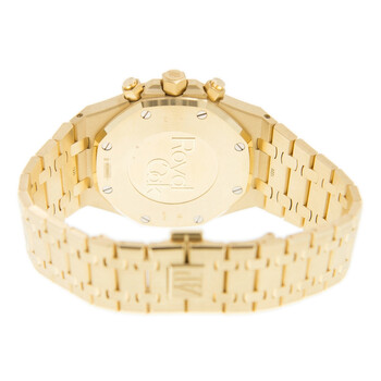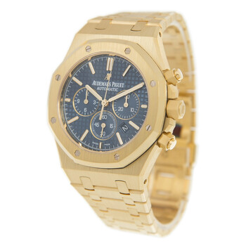 18kt yellow gold case with a 18kt yellow gold bracelet. 8 screws fixed 18kt yellow gold bezel. Blue dial with gold-tone hands and index hour markers. Dial Type: Analog. Luminescent hands and markers. Date display between 4 and 5 o'clock position. Chronograph - three sub-dials displaying: 60 second, 30 minute and 12 hours. Automatic movement with a 40-hour power reserve. Scratch resistant sapphire crystal. Screw down crown. Octagon case shape, case size: 41 mm, case thickness: 11 mm. Water resistant at 50 meters / 165 feet. Functions: chronograph, date, hour, minute, second. Luxury watch style. Watch label: Swiss Made. Audemars Piguet Royal Oak Automatic Men's 18-Carat Yellow Gold Chronograph Watch 26331BA.OO.1220BA.01.