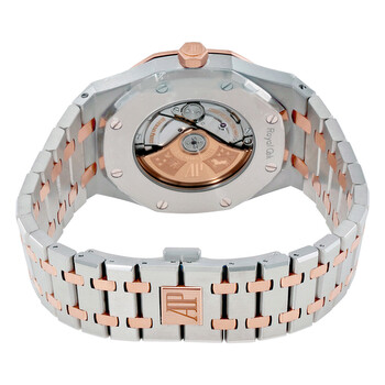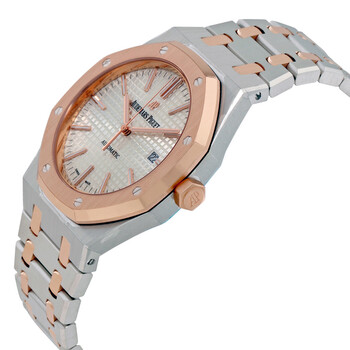 Stainless steel case with a two-tone (silver-tone and rose gold-tone) stainless steel and 18kt rose gold bracelet. 8 screws fixed 18kt rose gold bezel. Silver dial with rose gold-tone hands and index hour markers. Minute markers around the outer rim. Dial Type: Analog. Luminescent hands and markers. Date display at the 3 o'clock position. Audemars Piguet Calibre 3120 Automatic movement, containing 40 Jewels, composed of 280 parts, bitting at 21600 vph, and has a power reserve of approximately 60 hours. Scratch resistant sapphire crystal. Screw down crown. Transparent case back. Octagon case shape, case size: 41 mm, case thickness: 9.8 mm. Fold over with safety release clasp. Water resistant at 50 meters / 165 feet. Functions: date, hour, minute, second. Luxury watch style. Watch label: Swiss Made. Audemars Piguet Royal Oak Automatic Men's Watch 15400SR.OO.1220SR.01.