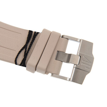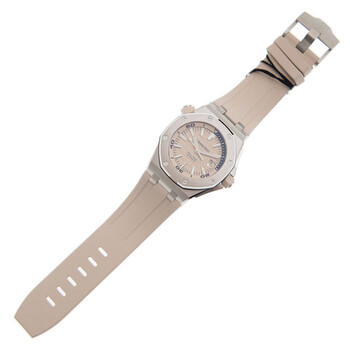 Silver-tone stainless steel case with a beige rubber strap. Fixed silver-tone stainless steel bezel. Beige dial with silver-tone hands and index hour markers. Minute markers around the outer rim. Dial Type: Analog. Luminescent hands and markers. Date display at the 3 o'clock position. Audemars Piguet Calibre 3120 Automatic movement, containing 40 Jewels, composed of 280 parts, bitting at 21600 vph, and has a power reserve of approximately 60 hours. Scratch resistant sapphire crystal. Screw down crown. Skeleton case back. Octagon case shape, case size: 42 mm, case thickness: 14.1 mm. Tang clasp. Water resistant at 300 meters / 1000 feet. Functions: date, hour, minute, second. Additional Info: rotating inner bezel. Royal Oak Series. Dive watch style. Watch label: Swiss Made. Audemars Piguet Royal Oak Automatic Men's Watch 15710STOOA085CA01.