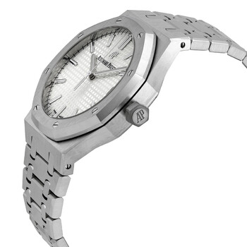 Stainless steel case with a silver-tone stainless steel bracelet. 8 screws fixed stainless steel bezel. Silver-tone dial with index hour markers. Minute markers around the outer rim. Dial Type: Analog. Luminescent hands. Date display at the 3 o'clock position. Audemars Piguet Calibre 4302 Automatic movement, containing 32 Jewels, bitting at 28800 vph, and has a power reserve of approximately 70 hours. Scratch resistant sapphire crystal. Screw locked crown. Transparent case back. Octagon case shape, case size: 41 mm, case thickness: 10.4 mm. Fold over clasp. Water resistant at 50 meters / 165 feet. Functions: date, hour, minute, second. Luxury watch style. Watch label: Swiss Made. Audemars Piguet Royal Oak Automatic Silver Dial Men's Watch 15500ST.OO.1220ST.04.