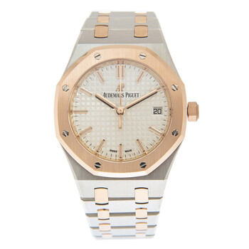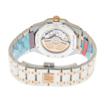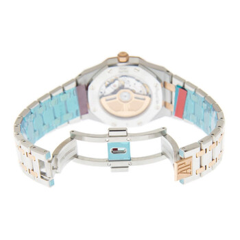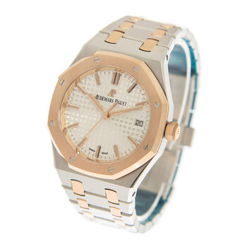 Stainless steel case with a two-tone stainless steel and 18kt rose gold bracelet. Fixed 18kt rose gold bezel. Silver-tone dial with index hour markers. Dial Type: Analog. Date display at the 3 o'clock position. Audemars Piguet Calibre 5800 Automatic movement, containing 28 Jewels, composed of 189 parts, bitting at 28800 vph, and has a power reserve of approximately 50 hours. Scratch resistant sapphire crystal. Screw down crown. Transparent see through case back. Case size: 34 mm, case thickness: 8.8 mm. Deployment clasp. Water resistant at 50 meters / 165 feet. Functions: date, hour, minute, second. Royal Oak Series. Luxury watch style. Watch label: Swiss Made. Audemars Piguet Royal Oak Automatic Silver Dial Watch 77350SR.OO.1261SR.01.