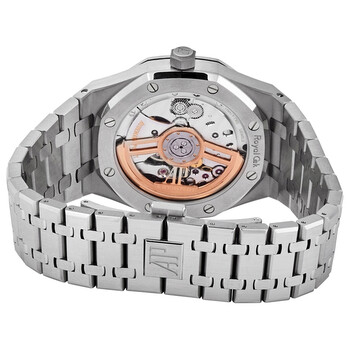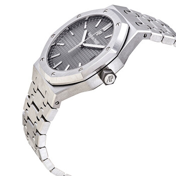 Stainless steel case with a stainless steel bracelet. Fixed (8 screws) stainless steel bezel. Slate grey dial with luminous white gold hands and index hour markers. Minute markers around the outer rim. Dial Type: Analog. Luminescent hands. Date display at the 3 o'clock position. Audemars Piguet calibre 4302 automatic movement, containing 32 Jewels, bitting at 28800 vph, and has a power reserve of approximately 70 hours. Scratch resistant sapphire crystal. Screw locked crown. Transparent case back. Octagon case shape. Case size: 41 mm. Case thickness: 10.4 mm. Fold over clasp. Water resistant at 50 meters / 165 feet. Functions: date, hour, minute, second. Luxury watch style. Watch label: Swiss Made. Audemars Piguet Royal Oak Automatic Slate Grey Dial Men's Watch 15500ST.OO.1220ST.02.