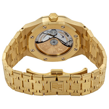18kt yellow gold case with a yellow gold-tone 18kt yellow gold bracelet. 8 screws fixed 18kt yellow gold bezel. Blue dial with gold-tone hands and index hour markers. Minute markers around the outer rim. Dial Type: Analog. Luminescent hands and markers. Date display at the 3 o'clock position. Audemars Piguet Calibre 3120 Automatic movement, containing 40 Jewels, composed of 280 parts, bitting at 21600 vph, and has a power reserve of approximately 60 hours. Scratch resistant sapphire crystal. Screw down crown. Skeleton transparent exhibition see through case back. Octagon case shape, case size: 37 mm, case thickness: 9.8 mm. Fold over with safety release clasp. Water resistant at 50 meters / 165 feet. Functions: date, hour, minute, second. Luxury watch style. Watch label: Swiss Made. Audemars Piguet Royal Oak Blue Dial 18 Carat Yellow Gold Automatic Midsize Watch 15450BA.OO.1256BA.02.