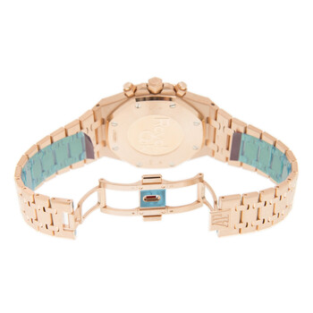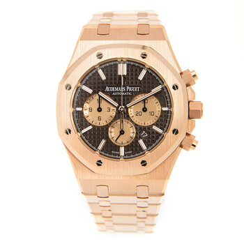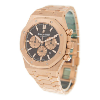 18kt rose gold case with an 18kt rose gold bracelet. Fixed 18kt rose gold bezel. Chocolate grande tapisserie dial with rose gold-tone hands and index hour markers. Minute markers around the outer rim. Dial Type: Analog. Luminescent hands and markers. Date display between the 4 and 5 o'clock positions. Chronograph - three sub-dials displaying: 60 second, 30 minute and 12 hour. Audemars Piguet calibre 2385 automatic movement, containing 37 Jewels, composed of 304 parts, bitting at 21600 vph, and has a power reserve of approximately 40 hours. Scratch resistant sapphire crystal. Screw down crown. Transparent case back. Octagon case shape. Case size: 41 mm. Case thickness: 11 mm. Butterfly clasp. Water resistant at 50 meters / 165 feet. Functions: chronograph, date, hour, minute, second. Royal Oak Series. Luxury watch style. Watch label: Swiss Made. Audemars Piguet Royal Oak Chocolate Dial Men's 18K Rose Gold Watch 26331OR.OO.1220OR.02.
