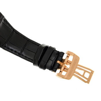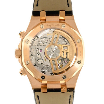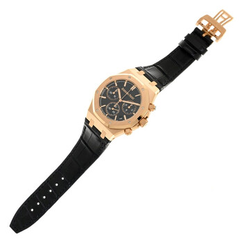 Rose gold-tone 18kt rose gold case with a black alligator band. Fixed rose gold-tone 18kt rose gold bezel. Black dial with rose gold-tone hands and index hour markers. Minute markers around the outer rim. Dial Type: Analog. Luminescent hands and markers. Date display between 4 and 5 o'clock position. Chronograph - three sub-dials displaying: 60 second, 30 minute and 12 hour. Audemars Piguet Calibre 4401 Automatic movement, containing 40 Jewels, composed of 367 parts, bitting at 28800 vph, and has a power reserve of approximately 70 hours. Scratch resistant sapphire crystal. Transparent see through case back. Octagon case shape, case size: 41 mm, case thickness: 12.4 mm. Deployment with push button release clasp. Water resistant at 50 meters / 165 feet. Functions: chronograph, column wheel, flyback, date, hour, minute, second. Additional Info: original box, international warranty card, manual (complete accessories). Royal Oak Series. Luxury watch style. Watch label: Swiss Made. Audemars