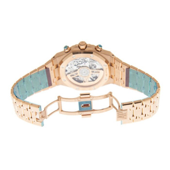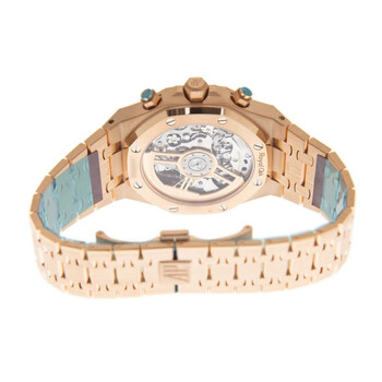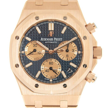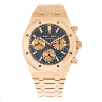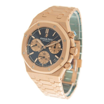 Rose gold-tone 18kt rose gold case and bracelet. Fixed rose gold-tone 18kt rose gold bezel. Blue dial with rose gold-tone hands and index hour markers. Minute markers around the outer rim. Dial Type: Analog. Luminescent hands and markers. Date display between 4 and 5 o'clock position. Chronograph - three sub-dials displaying: 60 second, 30 minute and 12 hour. Audemars Piguet Calibre 4401 Automatic movement, containing 40 Jewels, composed of 367 parts, bitting at 28800 vph, and has a power reserve of approximately 70 hours. Scratch resistant sapphire crystal. Screw down crown. Transparent see through case back. Octagon case shape, case size: 41 mm, case thickness: 12.38 mm. Deployment with push button release clasp. Water resistant at 50 meters / 165 feet. Functions: chronograph, column wheel, flyback, date, hour, minute, second. Additional Info: original box, international warranty card, manual (complete accessories). Royal Oak Series. Luxury watch style. Watch label: Swiss Made. Audemars Piguet Royal Oak Chronograph Automatic Blue Dial Men's Watch 26239OR.OO.1220OR.01.