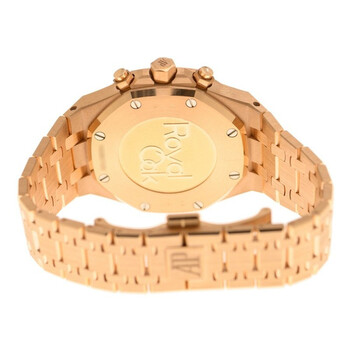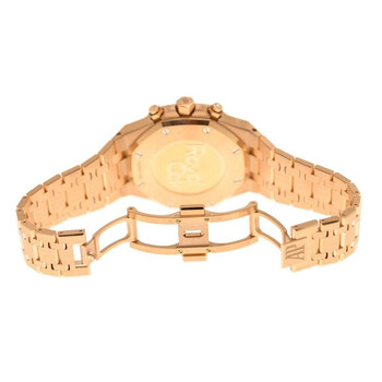 Rose gold-tone 18kt rose gold case and bracelet. Fixed rose gold-tone bezel with diamond set 18kt rose gold. Silver-tone dial with rose gold-tone hands and index hour markers. Minute markers around the outer rim. Dial Type: Analog. Luminescent hands and markers. Date display between 4 and 5 o'clock position. Chronograph - three sub-dials displaying: 60 second, 30 minute and 12 hour. Audemars Piguet Calibre 2385 Automatic movement, containing 37 Jewels, composed of 304 parts, bitting at 21600 vph, and has a power reserve of approximately 40 hours. Scratch resistant sapphire crystal. Screw down crown. Solid case back. Octagon case shape, case size: 38 mm. Deployment with push button release clasp. Water resistant at 50 meters / 165 feet. Functions: chronograph, column wheel, date, hour, minute, small second. Additional Info: original box, international warranty card, manual (complete accessories). Royal Oak Series. Luxury watch style. Watch label: Swiss Made. Audemars Piguet Royal Oak Chronograph Automatic Diamond Silver Dial Unisex Watch 26715OR.ZZ.1356OR.01.