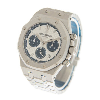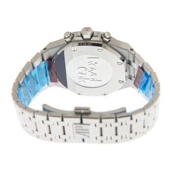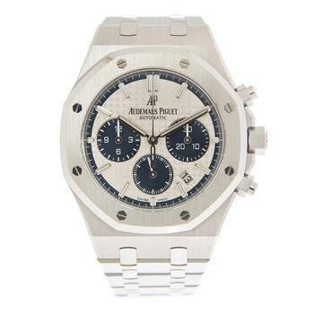 Silver-tone stainless steel case with a silver-tone stainless steel bracelet. Fixed silver-tone stainless steel bezel. Silver-tone dial with silver-tone hands and index hour markers. Minute markers around the outer rim. Dial Type: Analog. Luminescent hands and markers. Date display between 4 and 5 o'clock position. Chronograph - three sub-dials displaying: 60 second, 30 minute and 12 hour. Audemars Piguet Calibre 2385 Automatic movement, containing 37 Jewels, composed of 304 parts, bitting at 21600 vph, and has a power reserve of approximately 40 hours. Scratch resistant sapphire crystal. Screw down crown. Transparent case back. Octagon case shape, case size: 38 mm, case thickness: 11 mm. Hidden clasp. Water resistant at 50 meters / 165 feet. Functions: chronograph, column wheel, date, hour, minute, small second. Royal oak series. Luxury watch style. Watch label: Swiss Made. Audemars Piguet Royal Oak Chronograph Automatic Silver Dial Men's Watch 26315ST.OO.1256ST.01.