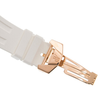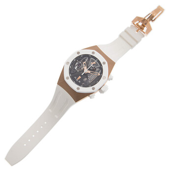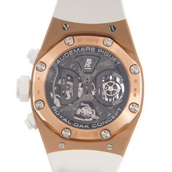 18kt pink gold case with a white rubber strap. 8 screws fixed white bezel. Black skeleton dial with rose gold-tone skeleton hands and index hour markers. Minute markers around the outer rim. Dial Type: Analog. Luminescent hands. Four sub-dials displaying: tourbillon, linear 30 minute, power reserve indicator and functions. Audemars Piguet Calibre 2941 Hand Wind movement, containing 34 Jewels, bitting at 21600 vph, and has a power reserve of approximately 237 hours. Scratch resistant sapphire crystal. Screw down crown. Transparent exhibition see through case back. Octagon case shape, case size: 44 mm, case thickness: 16.05 mm. Water resistant at 100 meters / 330 feet. Functions: tourbillon, chronograph, column wheel, hour, minute, power reserve indicator. Royal Oak Concept Tourbillon Chronograph Series. Luxury watch style. Watch label: Swiss Made. Audemars Piguet Royal Oak Concept Tourbillon Chronograph Skeleton Dial Automatic Men's Watch 26223RO.OO.D010CA.01.