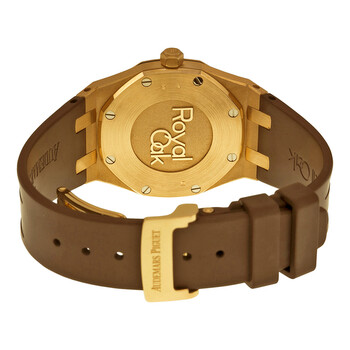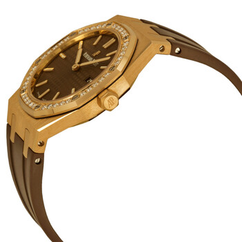 18 kt rose gold case with a brown rubber strap. Fixed 18 kt rose gold set with 40 diamonds bezel. Brown grande tapisserie dial with rose gold-tone hands and stick hour markers. Dial Type: Analog. Luminescent hands and markers. Date display appears at the 3 o'clock position. Quartz movement. Audemars piguet caliber 2713 engine. Scratch resistant sapphire crystal. Screw down crown. Solid case back. Case diameter: 33 mm. Case thickness: 7 mm. Octagonal case shape. Band width: 17.8 mm. Band length: 7 inches. Deployment with push button clasp. Water resistant at 50 meters / 165 feet. Functions: date, hour, minute, second. Luxury watch style. Watch label: Swiss Made. Audemars Piguet Royal Oak Diamond Brown Dial 18 kt Rose Gold Ladies Watch 67651OR.ZZ.D080CA.01.