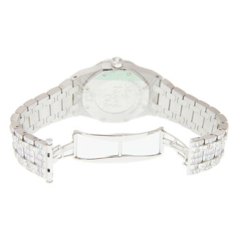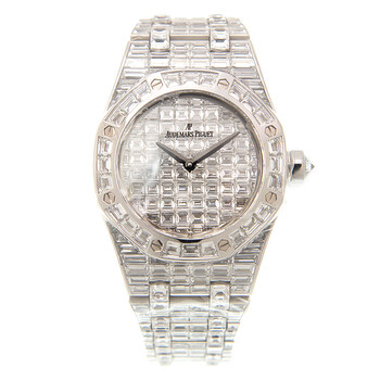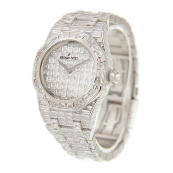 18 kt white gold case set with diamonds with an 18 kt white gold bracelet set with diamonds. Fixed bezel set with diamonds. Diamond pave dial with black hands. 444 baguette-cut diamonds on case and bracelet (32.91 ctw) and 76 baguette-cut diamonds on the dial (4.85 ctw). Dial Type: Analog. Quartz movement. Calibre 2712 engine. Scratch resistant sapphire crystal. Solid case back. Case diameter: 33 mm. Case thickness: 10.2 mm. Octagon case shape. Deployment clasp with push button. Functions: hour, minute. Luxury watch style. Audemars Piguet Royal Oak Diamond Pave White Gold Ladies Watch 67606BC.ZZ.9179BC.01.