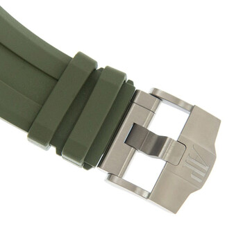 Silver-tone stainless steel case with a green rubber strap. Fixed silver-tone stainless steel bezel. Green dial with silver-tone hands and index hour markers. Minute markers around the outer rim. Dial Type: Analog. Luminescent hands and markers. Date display at the 3 o'clock position. Audemars Piguet Calibre 4308 automatic movement with a 60-hour power reserve. Scratch resistant sapphire crystal. Screw down crown. Transparent see through case back. Octagon case shape, case size: 42 mm. Buckle clasp. Water resistant at 300 meters / 1000 feet. Functions: date, hour, minute, second. Additional Info: original box, manual (complete accessories). Royal Oak Offshore Series. Luxury watch style. Watch label: Swiss Made. Audemars Piguet Royal Oak Offshore Automatic Green Dial Men's Watch 15720ST.OO.A052CA.01.