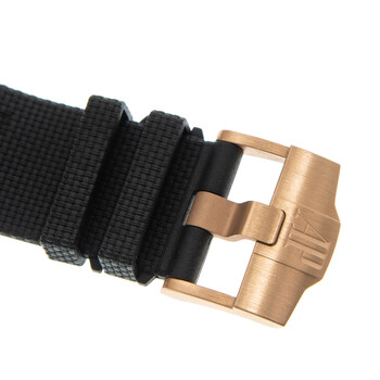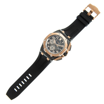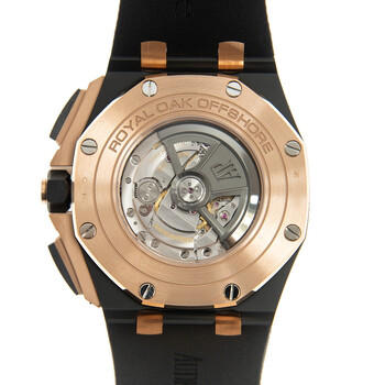 Ceramic case with a grey rubber strap. Fixed 18kt rose gold bezel. Black dial with Arabic numeral hour markers. Dial Type: Analog. Date display at the 3 o'clock position. Chronograph - three sub-dials displaying: 60 second, 30 minute and 12 hour. Audemars Piguet Calibre 3126/3840 Automatic movement, based upon Audemars Piguet 3120, containing 59 Jewels, composed of 365 parts, bitting at 21600 vph, and has a power reserve of approximately 50 hours. Scratch resistant sapphire crystal. Screw down crown. Transparent see through case back. Case size: 44 mm, case thickness: 14.4 mm. Tang clasp. Water resistant at 100 meters / 330 feet. Functions: chronograph, date, hour, minute, small second. Royal Oak Offshore Series. Casual watch style. Watch label: Swiss Made. Audemars Piguet Royal Oak Offshore Chronograph Automatic Black Dial Men's Watch 26405NR.OO.A002CA.01.