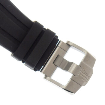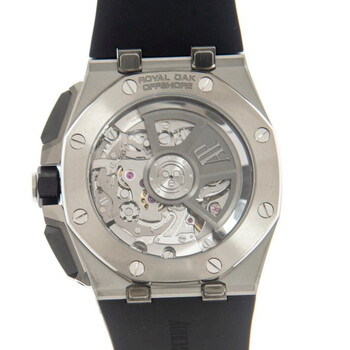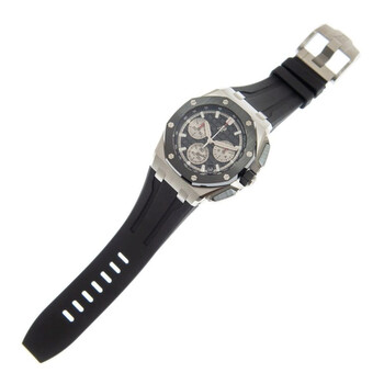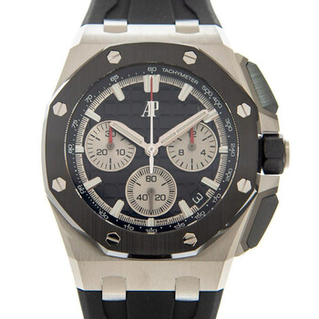 Silver-tone stainless steel case with a black rubber strap. Fixed black ceramic bezel. Black dial with silver-tone hands and index hour markers. Minute markers around the outer rim. Dial Type: Analog. Luminescent hands and markers. Date display between 4 and 5 o'clock position. Chronograph - three sub-dials displaying: 60 second, 30 minute and 12 hour. Audemars Piguet Calibre 4401 Automatic movement, containing 40 Jewels, composed of 367 parts, bitting at 28800 vph, and has a power reserve of approximately 70 hours. Scratch resistant sapphire crystal. Screw down crown. Transparent see through case back. Octagon case shape, case size: 43 mm, case thickness: 14.4 mm. Buckle clasp. Water resistant at 100 meters / 330 feet. Functions: chronograph, column wheel, flyback, date, hour, minute, second. Additional Info: original box, international warranty card, manual (complete accessories). Royal Oak Offshore Series. Luxury watch style. Watch label: Swiss Made. Audemars Piguet Royal Oak Offshor