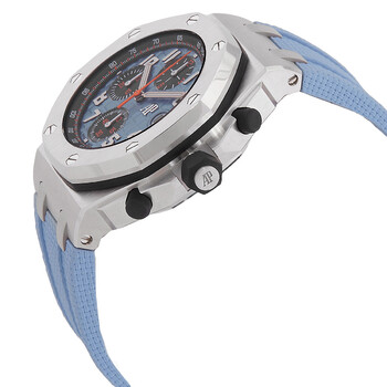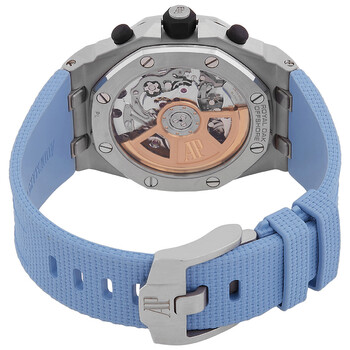 Silver-tone stainless steel case with a blue rubber strap. Fixed silver-tone stainless steel bezel. Blue dial with silver-tone hands and Arabic numeral hour markers. Minute markers around the outer rim. Dial Type: Analog. Luminescent hands and markers. Date display at the 3 o'clock position. Chronograph - three sub-dials displaying: 60 second, 30 minute and 12 hour. Audemars Piguet Calibre 4404 automatic movement. Scratch resistant sapphire crystal. Screw down crown. Transparent see through case back. Octagon case shape, case size: 42 mm, case thickness: 15.2 mm. Buckle clasp. Water resistant at 100 meters / 330 feet. Functions: chronograph, date, hour, minute, second. Royal Oak Offshore Series. Casual watch style. Watch label: Swiss Made. Audemars Piguet Royal Oak Offshore Chronograph Automatic Blue Dial Men's Watch 26238ST.OO.A340CA.01.