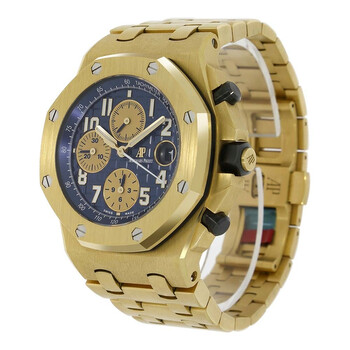 Yellow gold-tone 18kt yellow gold case with a yellow gold-tone 18kt yellow gold bracelet. 8 screws fixed yellow gold-tone 18kt yellow gold bezel. Blue dial with gold-tone hands and Arabic numeral hour markers. Minute markers around the outer rim. Dial Type: Analog. Luminescent hands and markers. Date display at the 3 o'clock position. Chronograph - three sub-dials displaying: 60 second, 30 minute and 12 hour. Audemars Piguet Calibre 3126/3840 Automatic movement, based upon Audemars Piguet 3120, containing 59 Jewels, composed of 365 parts, bitting at 21600 vph, and has a power reserve of approximately 50 hours. Scratch resistant sapphire crystal. Screw down crown. Transparent case back. Octagon case shape, case size: 42 mm, case thickness: 14.55 mm. Butterfly clasp. Water resistant at 100 meters / 330 feet. Functions: chronograph, date, hour, minute, small second. Luxury watch style. Watch label: Swiss Made. Audemars Piguet Royal Oak Offshore Chronograph Automatic Blue Dial Men's Watch 26470BA.OO.1000BA.01.