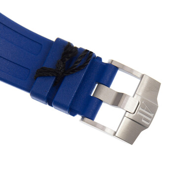 Silver-tone stainless steel case with a blue rubber strap. Fixed silver-tone stainless steel bezel. Blue dial with silver-tone hands and Arabic numeral hour markers. Tachymeter around the outer rim. Dial Type: Analog. Luminescent hands. Date display between 4 and 5 o'clock position. Chronograph - three sub-dials displaying: 60 second, 30 minute and 12 hour. Audemars Piguet Calibre 2385 Automatic movement, containing 37 Jewels, composed of 304 parts, bitting at 21600 vph, and has a power reserve of approximately 40 hours. Scratch resistant sapphire crystal. Screw down crown. Solid case back. Octagon case shape, case size: 54 mm x 42 mm, case thickness: 14.5 mm. Band width: 20.3 mm, band length: 8 inches. Tang clasp. Water resistant at 50 meters / 165 feet. Functions: chronograph, column wheel, date, hour, minute, small second. Royal Oak Offshore Series. Sport watch style. Watch label: Swiss Made. Audemars Piguet Royal Oak Offshore Chronograph Automatic Blue Dial Men's Watch 26470ST.OO.A030CA.01.