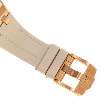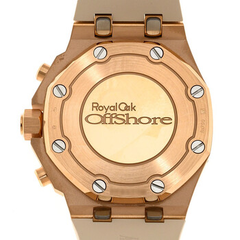 18kt rose gold case with a beige rubber strap. Fixed (8 screw) 18kt rose gold with 32 diamonds bezel. Blue dial with index hour markers. Minute markers around the outer rim. Dial Type: Analog. Luminescent hands and markers. Date display between the 4 and 5 o'clock positions. Chronograph - three sub-dials displaying: 60 second, 30 minute and 12 hour. Audemars Piguet Calibre 2385 Automatic movement, containing 37 Jewels, composed of 304 parts, bitting at 21600 vph, and has a power reserve of approximately 40 hours. Scratch resistant sapphire crystal. Screw down crown. Solid case back. Octagon case shape, case size: 37 mm, case thickness: 12.4 mm. Fold over (audemars piguet) clasp. Water resistant at 50 meters / 165 feet. Functions: chronograph, column wheel, date, hour, minute, small second. Additional Info: bezel set with 32 brilliant-cut diamonds ; ~1.02 carats. Royal Oak Offshore Series. Luxury watch style. Watch label: Swiss Made. Audemars Piguet Royal Oak Offshore Chronograph Automatic Diamond Blue Dial Ladies Watch 26231OR.ZZ.A085CA.01.