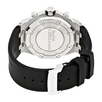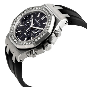 Stainless steel case with a black rubber strap. Fixed (8 screws) stainless steel bezel set with 32 diamonds. Black (tapisserie design) dial with luminous silver-tone hands and index hour markers. Minute markers around the outer rim. Dial Type: Analog. Luminescent hands and markers. Date display between the 4 and 5 o'clock positions. Chronograph - three sub-dials displaying: 60 second, 30 minute and 12 hour. Audemars Piguet calibre 2385 automatic movement, containing 37 Jewels, composed of 304 parts, bitting at 21600 vph, and has a power reserve of approximately 40 hours. Scratch resistant sapphire crystal. Screw down crown. Solid case back. Octagon case shape. Case size: 37 mm. Case thickness: 11.8 mm. Audemars Piguet fold over clasp. Water resistant at 50 meters / 165 feet. Functions: chronograph, column wheel, date, hour, minute, small second. Additional Info: bezel set with 32 brilliant-cut diamonds ; ~1.02 carats. Royal Oak Offshore Series. Luxury watch style. Watch label: Swiss Made. Audemars Piguet Royal Oak Offshore Chronograph Automatic Diamond Men's Watch 26231ST.ZZ.D002CA.01.