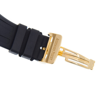 18k yellow gold case with a blue rubber strap. Gold-tone diamond set bezel. Blue with "lady tapisserie" pattern dial with yellow gold hands and index hour markers. Dial Type: Analog. Luminescent hands and markers. Date display between 4 and 5 o'clock position. Chronograph - three sub-dials displaying: 60 second, 30 minute and 12 hour. Audemars Piguet Calibre 2385 Automatic movement, containing 37 Jewels, composed of 304 parts, bitting at 21600 vph, and has a power reserve of approximately 40 hours. Scratch resistant sapphire crystal. Screw down crown. Solid case back. Octagonal case shape, case size: 37 mm, case thickness: 12.35 mm. Folding clasp. Water resistant at 50 meters / 165 feet. Functions: chronograph, date, hour, minute, second. Royal Oak Offshore Series. Luxury watch style. Watch label: Swiss Made. Audemars Piguet Royal Oak Offshore Chronograph Automatic Diamond Watch 26231BA.ZZ.D027CA.01.