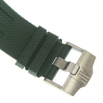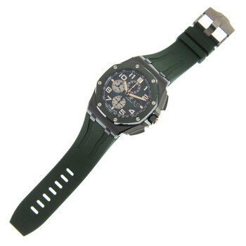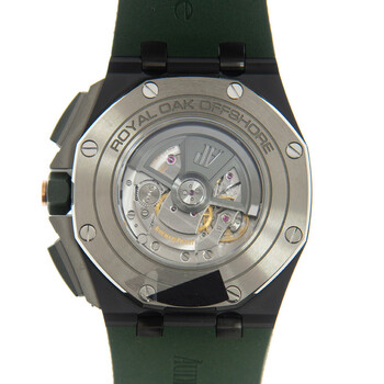 Ceramic case with a green rubber strap. Fixed ceramic bezel. Green dial with Arabic numeral hour markers. Dial Type: Analog. Date display at the 3 o'clock position. Chronograph - three sub-dials displaying: 60 second, 30 minute and 12 hour. Audemars Piguet Calibre 3126/3840 Automatic movement, based upon Audemars Piguet 3120, containing 59 Jewels, composed of 365 parts, bitting at 21600 vph, and has a power reserve of approximately 50 hours. Scratch resistant sapphire crystal. Screw down crown. Transparent see through case back. Case size: 44 mm, case thickness: 14.4 mm. Tang clasp. Water resistant at 100 meters / 330 feet. Functions: chronograph, date, hour, minute, small second. Royal Oak Offshore Series. Casual watch style. Watch label: Swiss Made. Audemars Piguet Royal Oak Offshore Chronograph Automatic Green Dial Men's Watch 26405CE.OO.A056CA.01.
